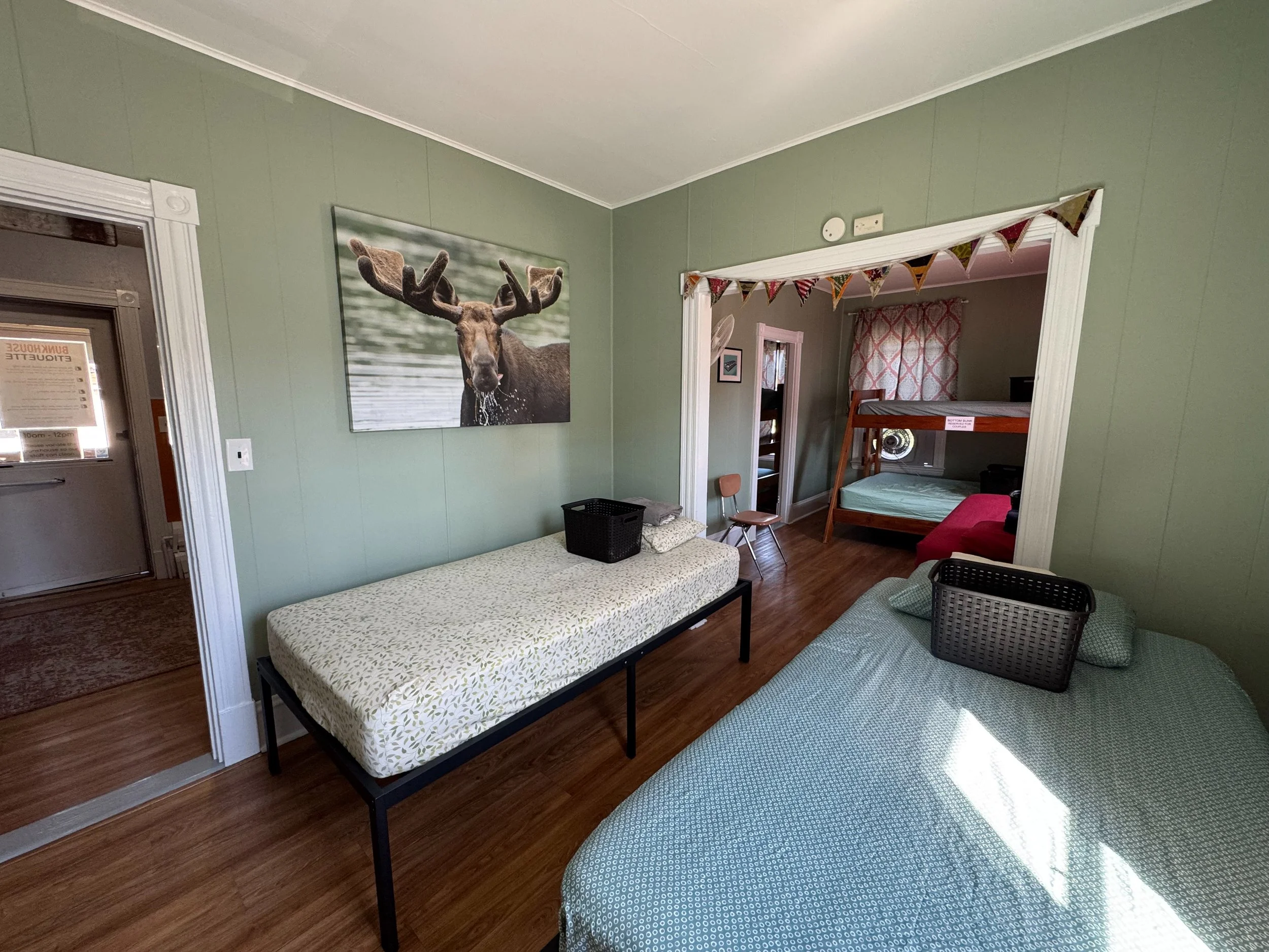This cozy space is separate from the rest of the Hostel and will be your own little haven. The suites have their own kitchen, dining area, and bathroom. While we do not offer B&B style food, the kitchen within the suite has all of the cookware and appliances you will need to prepare your own meals. Family/Group Suite 1 includes a private room with a queen bed and two futon sofas in the living room. Family/Group Suite 2 has five twin beds. On the premises is a coin-operated communal washer & dryer for your use as well. The suites have air-conditioning in the summer months.